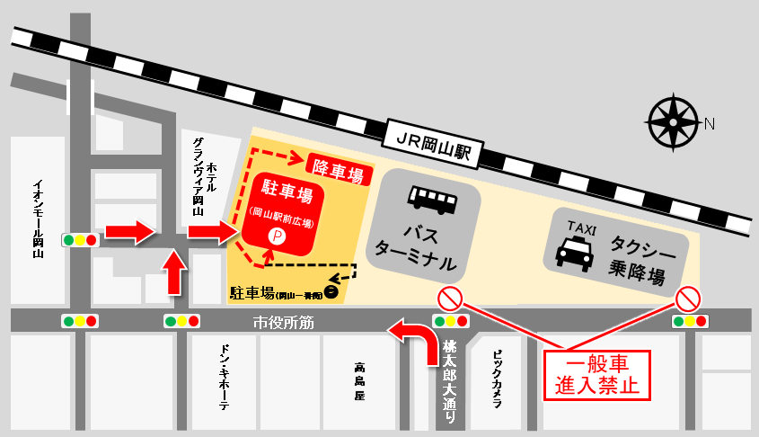 岡山駅へのお送り、お迎え、駐車は用途に応じて降車場、駐車場のご利用をお願いします。