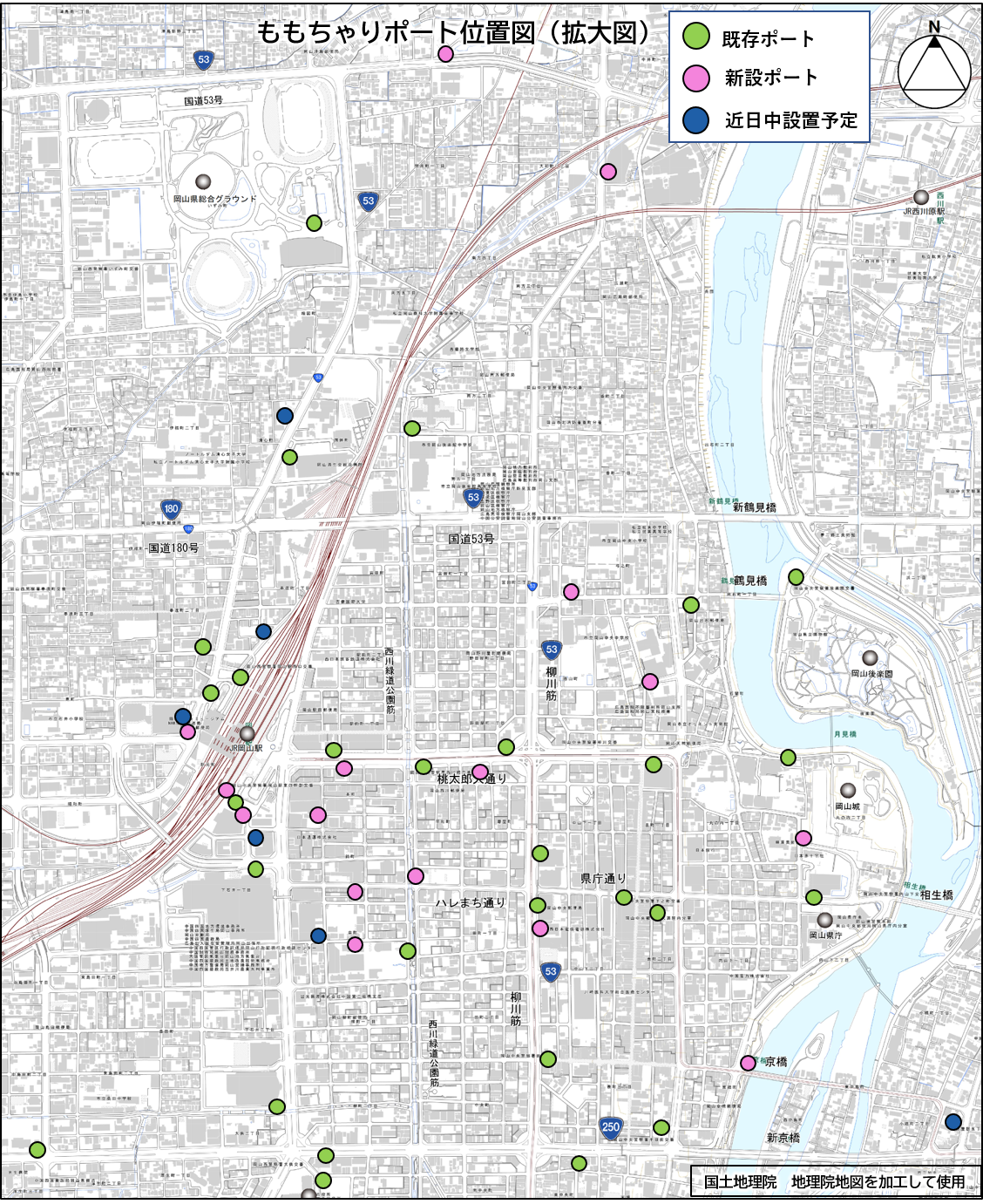 北長瀬・問屋町、中区の一部等にポート設置エリアを拡大し、既存の35か所に加え、新たにコンビニエンスストアやスーパーマーケットなどにポートを設置を進めていきます。