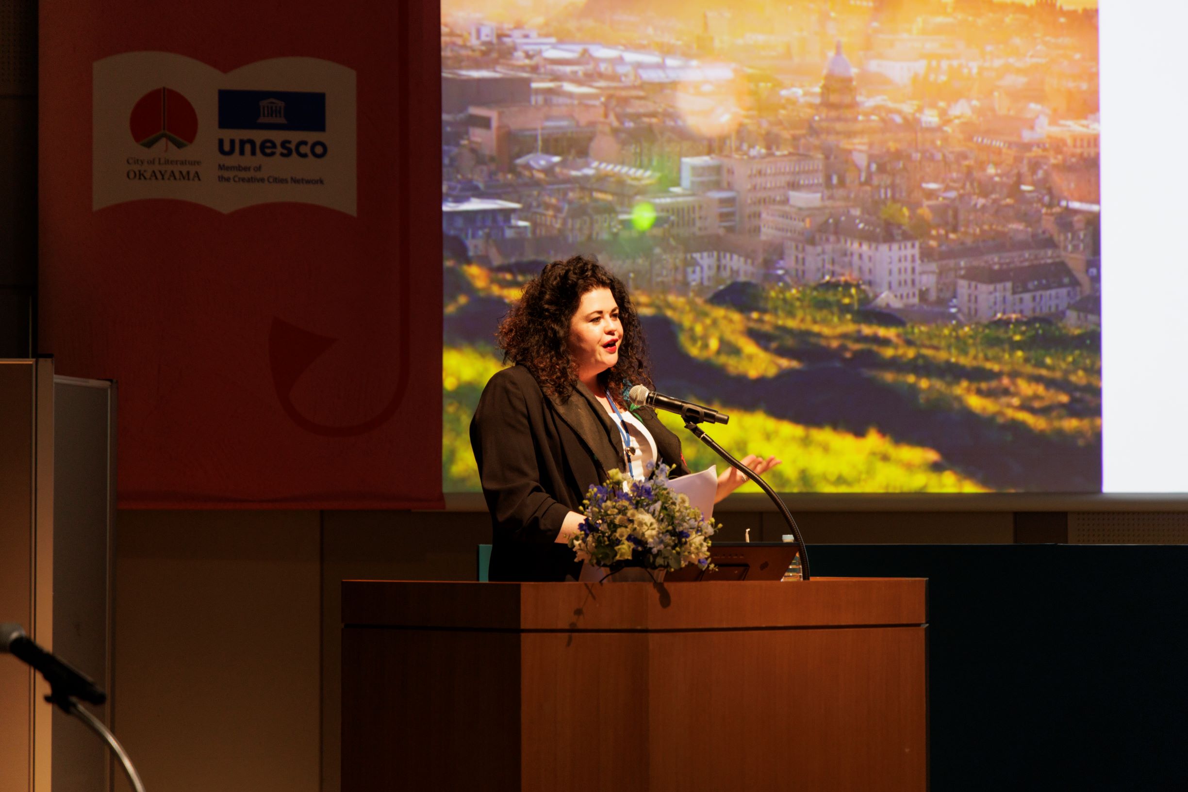 エディンバラ(イギリス)のハリエット・マクミランさんが「嵐に揺るがない石~火山岩の上に築かれた文学のまち~」と題して講演されました。