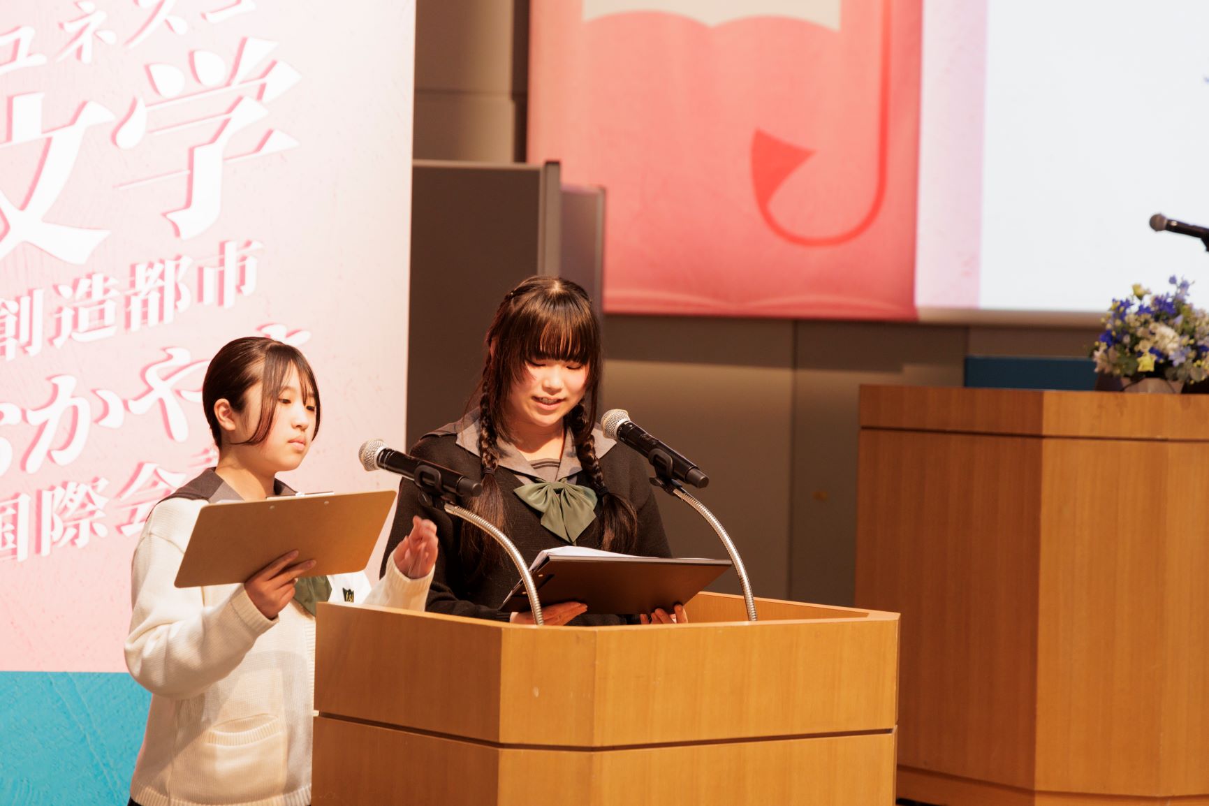 第一部でエディンバラの活動紹介、第二部で小説家・小川洋子さん、作家・中脇初枝さんの対談を行いました。司会は2月10日の事例発表にも参加してくれた山陽学園高校から、放送部の岡﨑友愛さん、柴田陽莉さんが担当。