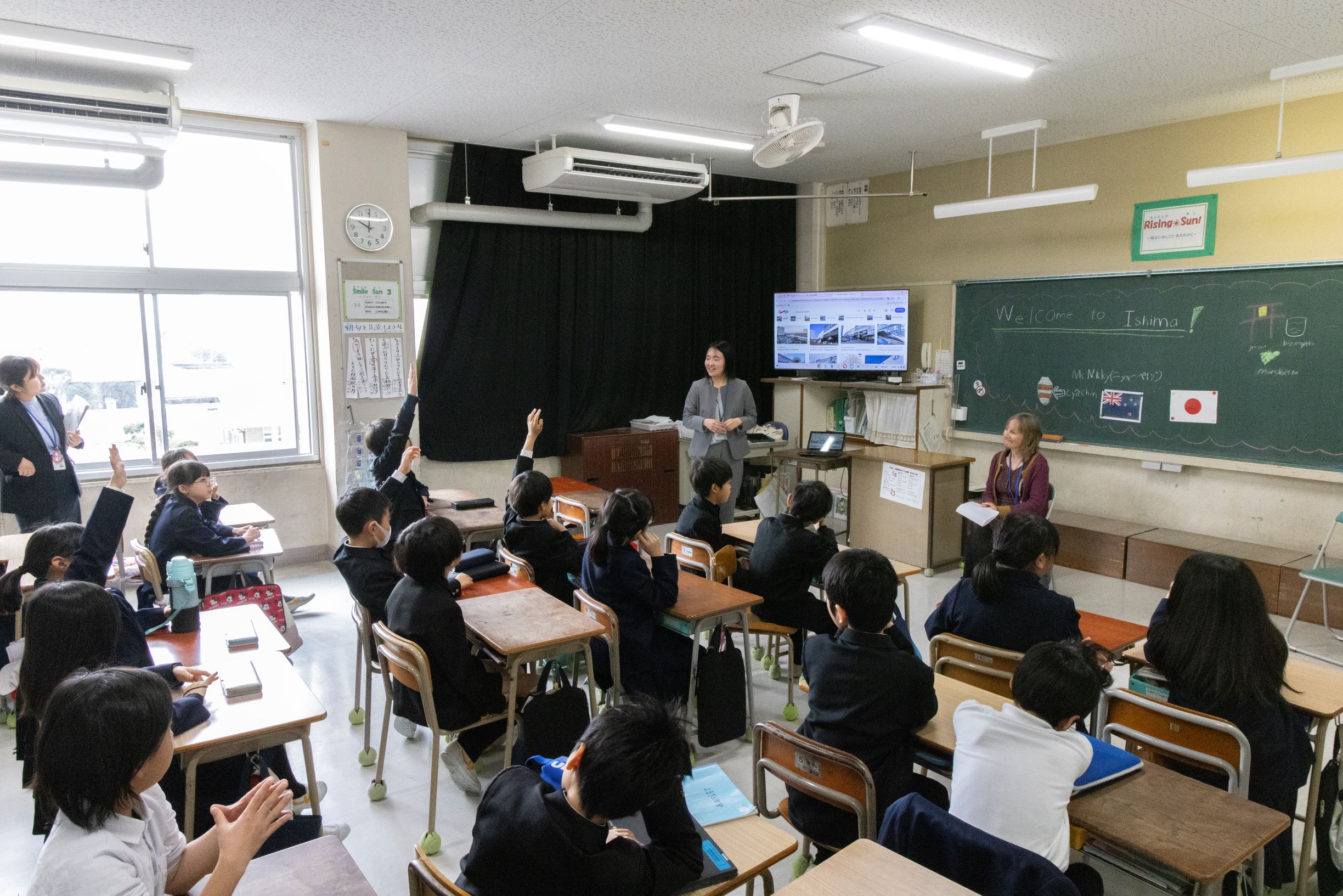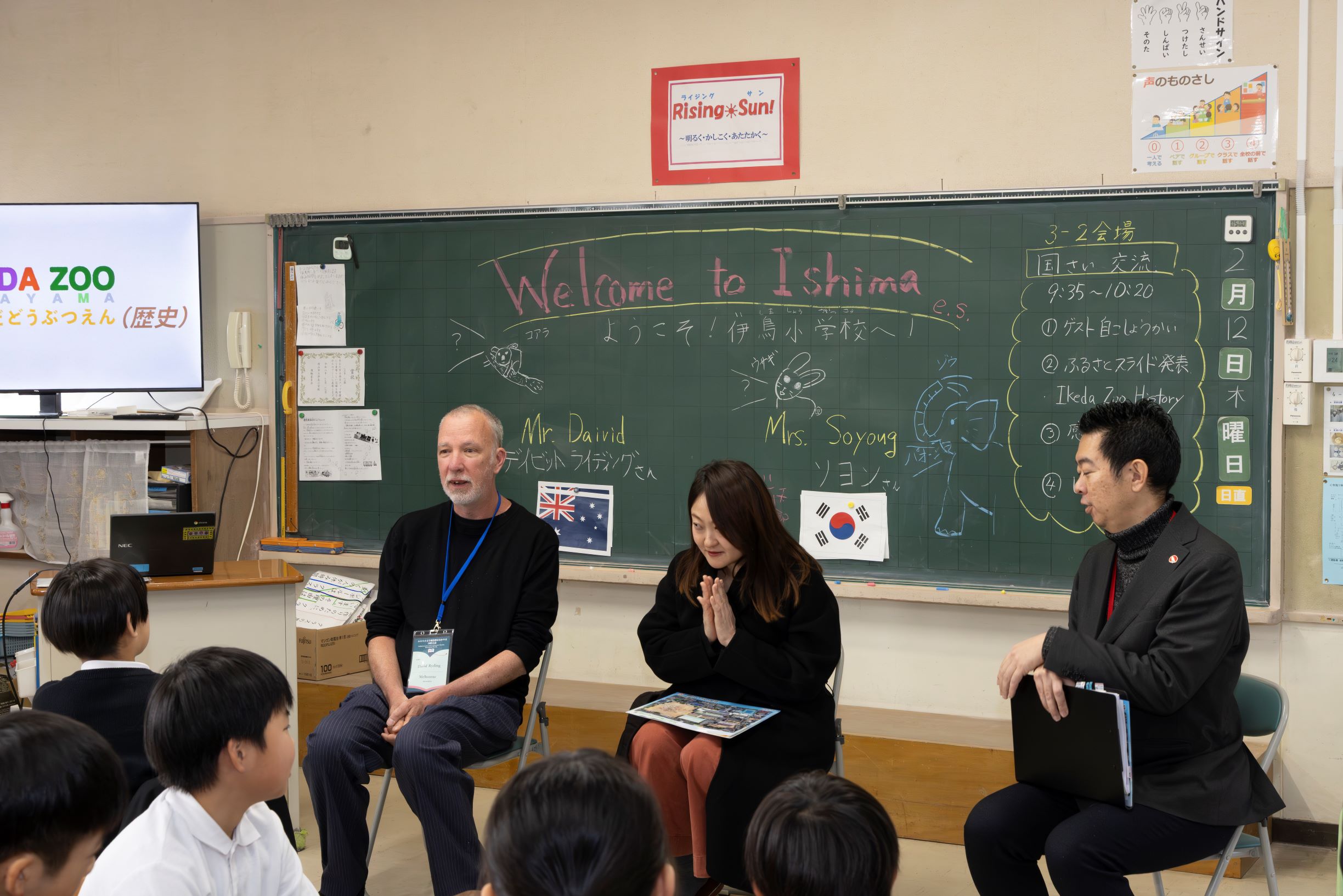 池田動物園、岡山県総合グラウンドなどが学区内にある伊島小学校で、4年生の「総合的な学習」で地域のことについて学習した内容を子どもたちが発表しました。発表の後には質問の時間もあり、ゲストの国の文化や食べ物、流行っている遊びなどについて質問があり、楽しく交流しました。