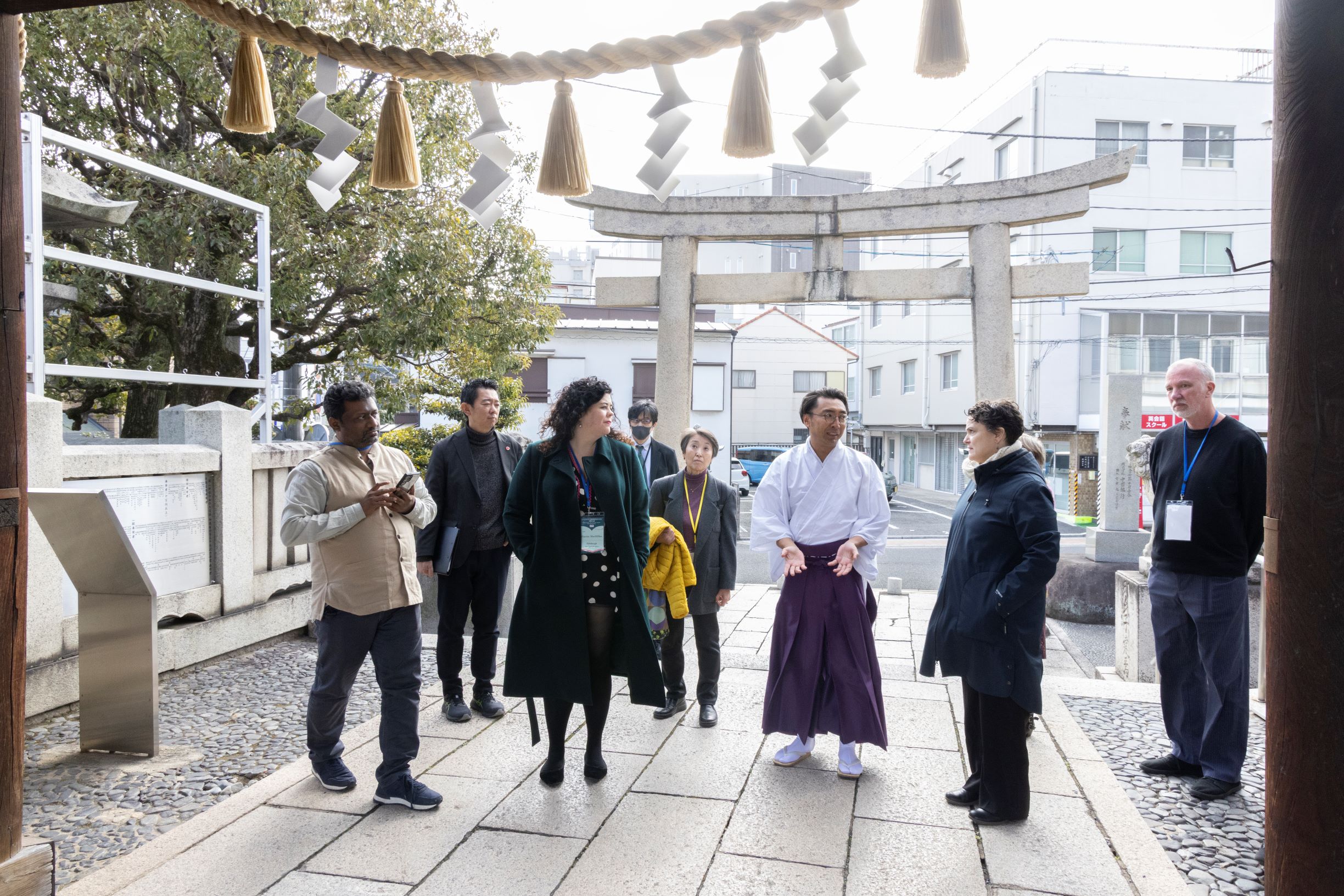 到着後、岡山神社の久山信太郎 宮司から、神道、神社、古事記等について、歴史・文化の切り口から説明があり、参加者は熱心に聞き入っていました。儀式や風習などに関する質問もあり、海外ゲストたちが日本文化についての理解を深めることができたのではないでしょうか。