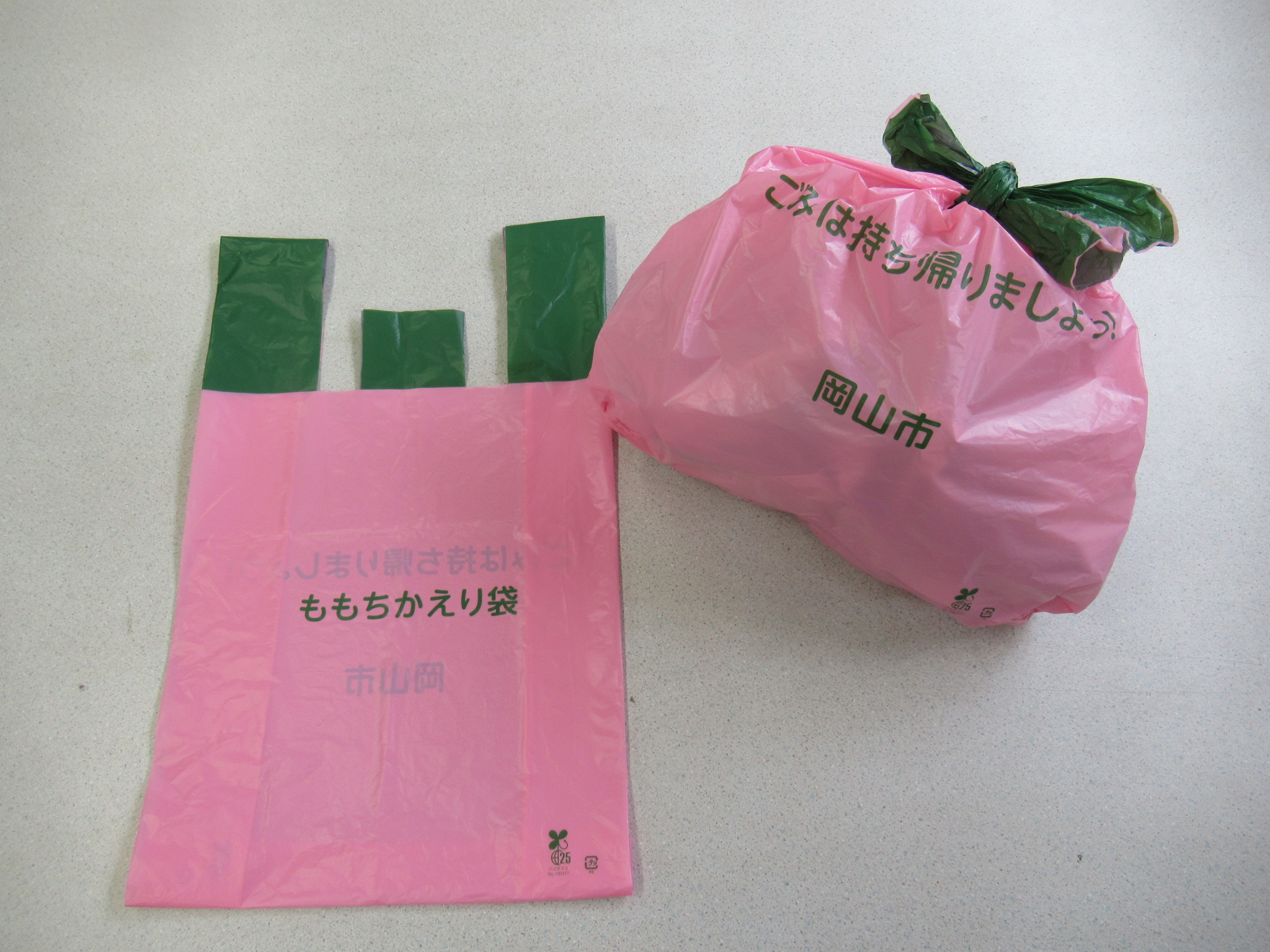 岡山の特産である桃をモチーフにしたデザインで、ごみを入れて持ち手を結ぶと、愛らしい桃の袋が誕生します!