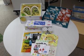 岡山を感じてもらえるよう、記念品として岡山市からは「シャインマスカット」を、岡山商科大学からは「蒜山ジャージーヨーグルト」を、おかやまスポーツプロモーション機構からは「高原ブッセ」を贈呈しました。