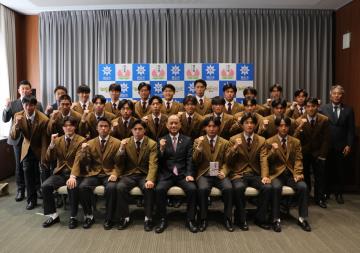 令和7年12月28日から令和8年1月12日に東京都で開催される「令和7年度 第104回全国高等学校サッカー選手権大会」に出場する岡山学芸館高等学校サッカー部の選手と関係者が、大森市長を表敬訪問しました。