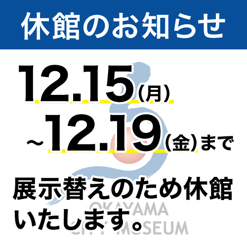2025年12月14日岡山シティミュージアム■12月15日((月曜日)曜日)-12月19日(金曜日)は、休館いたします。2025年12月15日(月曜日)から12月19日(金曜日)は、展示替えのため、休館いたします。