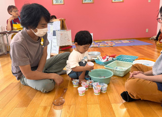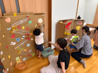 室内で金魚すくい遊び…のつもりで出していた金魚たちですが、子どもたちは遊びの天才!