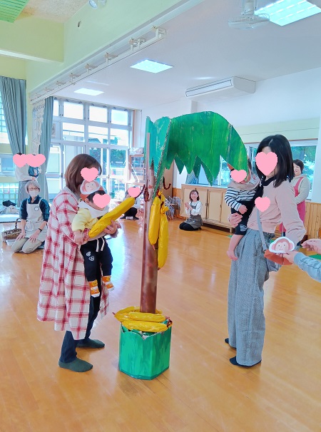 みんながおさるのお面をかぶって、バナナを収穫してもらいます(^^)