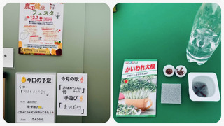 こちらはスタッフが1週間前にタネをまいた見本のかいわれ大根(と、試しにやってみたリーフレタス)