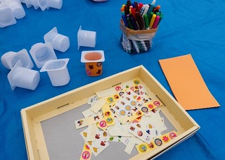 まずはオレンジ色の紙に自由に絵を描いたりシールを貼ったりして、ヨーグルトカップに巻きつけます。