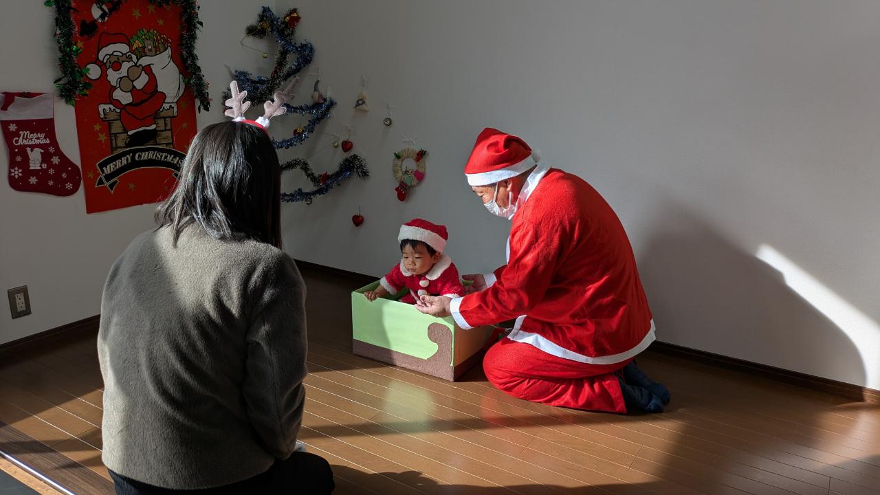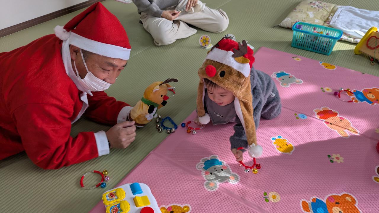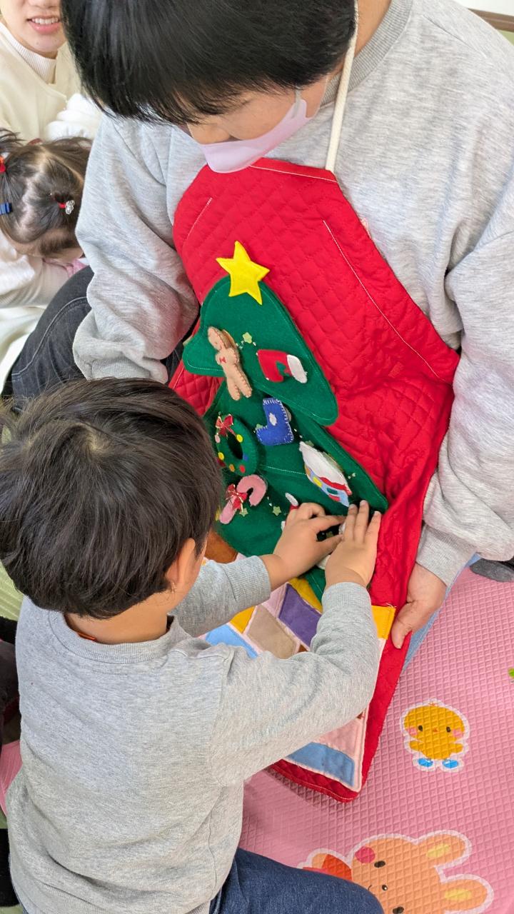 今年もあとわずかになりました先日、お楽しみ会🎄で2学期を締めくくりましたベビーちゃんが多くなって来たため、サンタさんとのふれあい遊びがメインになりました✨不思議と泣き出す子は居なくて楽しく過ごせましたまつぼっくりツリーの製作や、音楽に合わせて鈴を鳴らしたり、大型絵本、スタッフ手作りのエプロンシアターなどで楽しみましたサンタさんからのプレゼントもありましたよ😊来年の開催予定日は、1月7日(水曜日)です