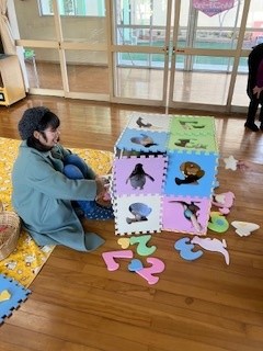 マイペースに積み木マットを立体的に組み立てておうちを作って遊ぶ姿も見られました。