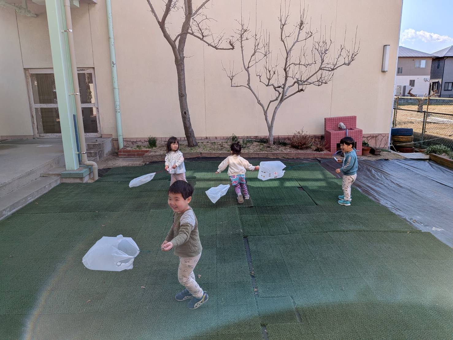 完成した凧を手に外へ出ると、強い風が吹いていましたが、子どもたちは大喜び。