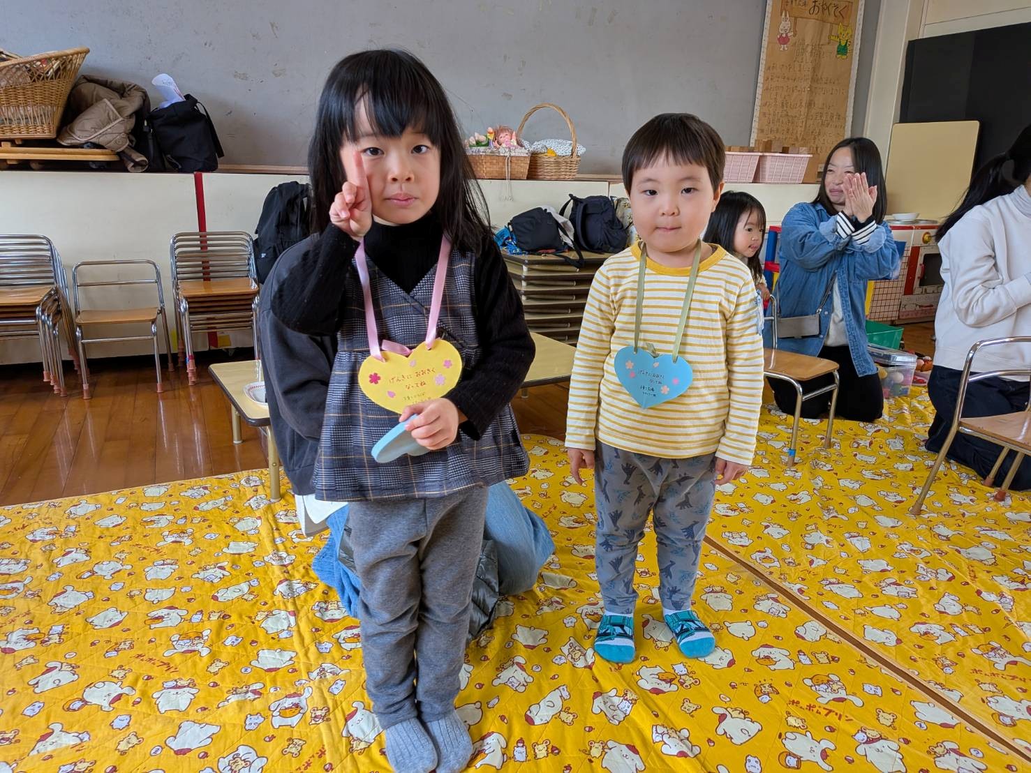 子育て広場を卒業して、春から新しい生活が始まる親子には、「おめでとう」のメダルを用意しました。