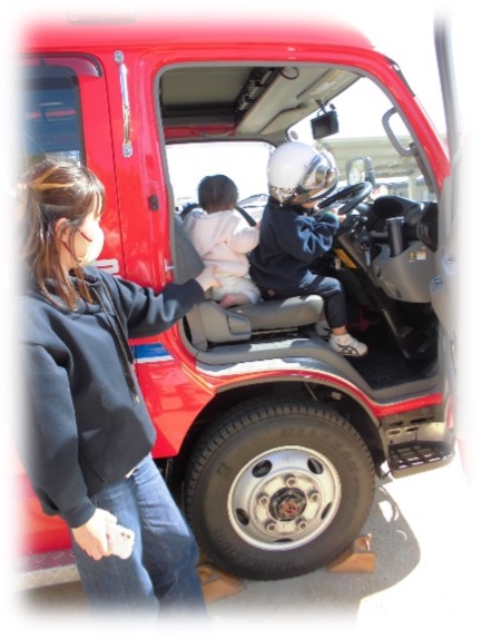講習の後はお楽しみの消防車見学。興味深々で小さな消防士さんになりました。