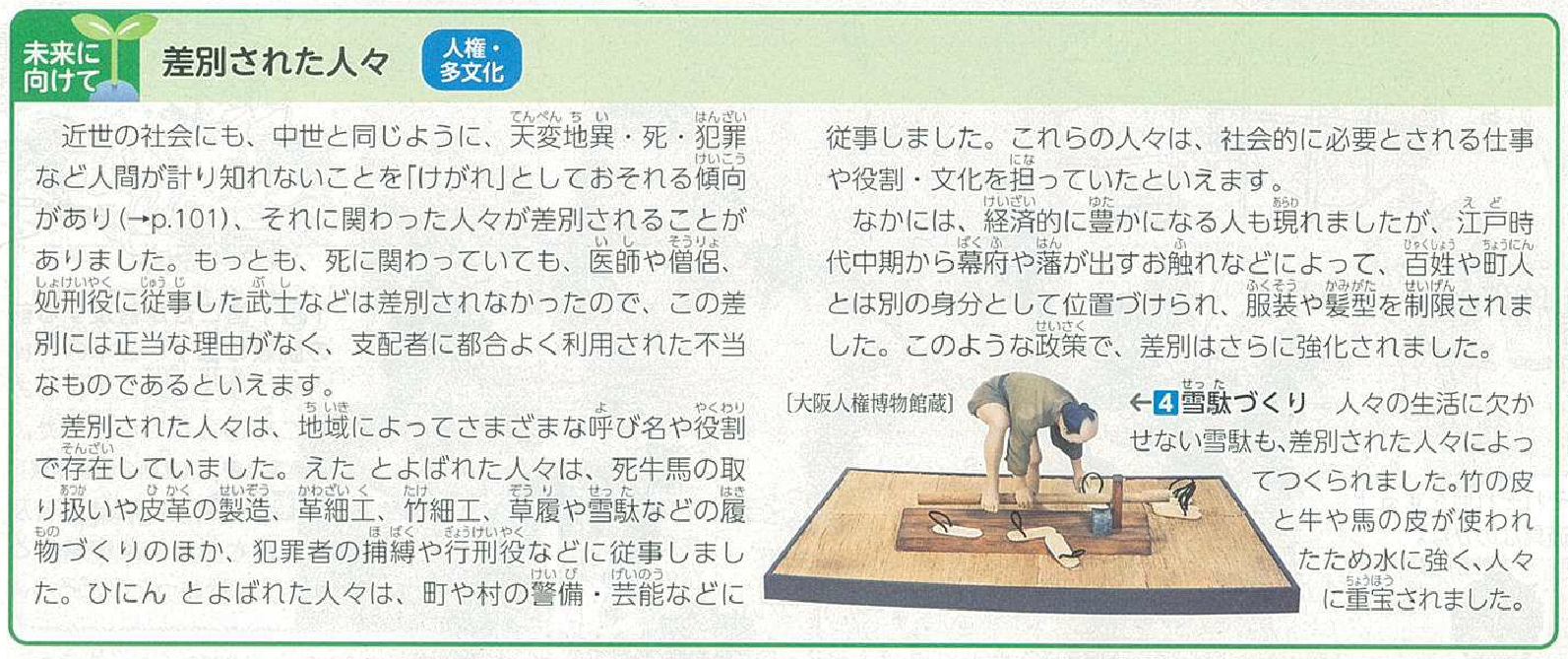 しかし、それは単に差別的身分の呼称等を廃止し、身分と職業が平民なみにあつかわれることを宣言したにとどまりました。また、これらの人々が主に携わってきた特定の職業に、さまざまな人々もつくようになり、かえって経済的に苦しくなったとも言われています。