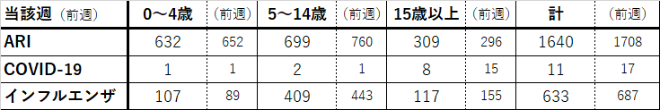 • 15歳未満の急性呼吸器感染症報告数は、第8週が1331件、第7週が1412件で減少しました。
