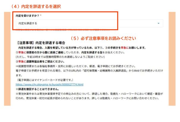 ※WEBでご回答いただくとともに、早急に保護者の方から内定した園へ直接ご連絡いただき、辞退をお伝えください。