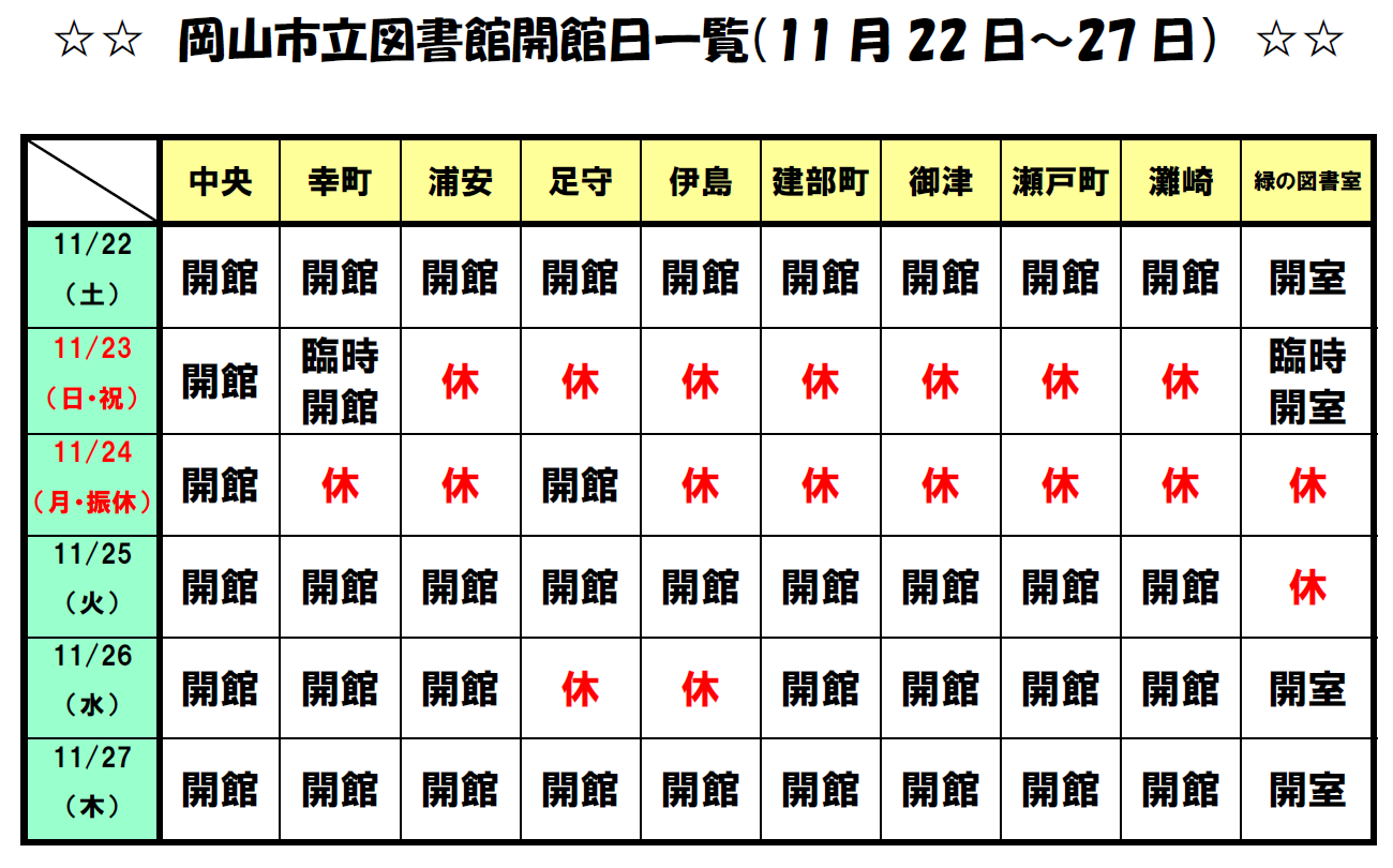 令和7年11月22日(土曜日)から27日(木曜日)の休館日