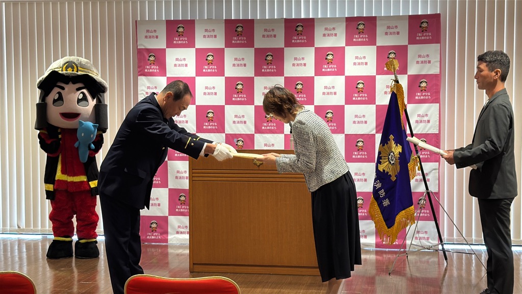 岡山市南区でテニスのレッスン中、心臓が止まり突然倒れた受講生に、近くにいた仲間とコーチがAEDを使って応急手当を実施し、素早い手当と通報により、その場で意識が回復、社会復帰する事ができました。その功績を称え、南消防署で感謝状を贈呈しました。