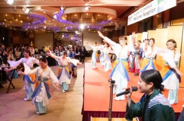 21日夜の歓迎レセプションでは、岡山ならではの料理や地酒を提供。学生が書道や折り鶴などの和文化体験を運営、鼓のオープニング演奏や獅子舞の演舞も披露されました。