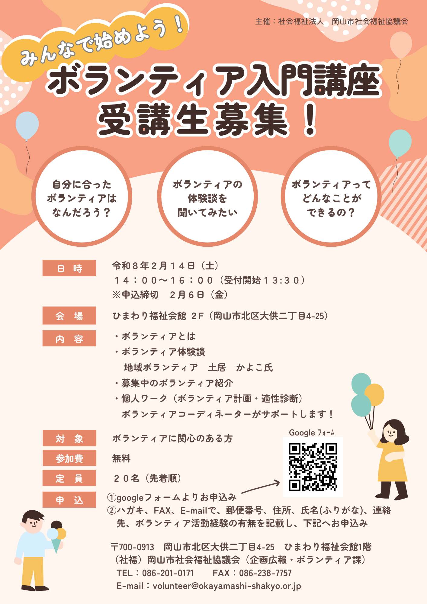 googleフォーム別ウィンドウで開く、はがき、Fax、E-mailにて郵便番号、住所、氏名(ふりがな)、年齢、電話番号、ボランティア活動の経験の有無を記載の上、下記連絡先へ申込。