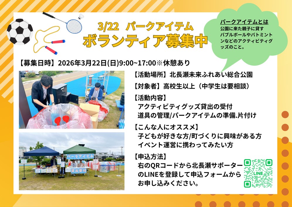 ブランチ岡山北長瀬で開催するパークアイテムのボランティアスタッフさんを募集しています。