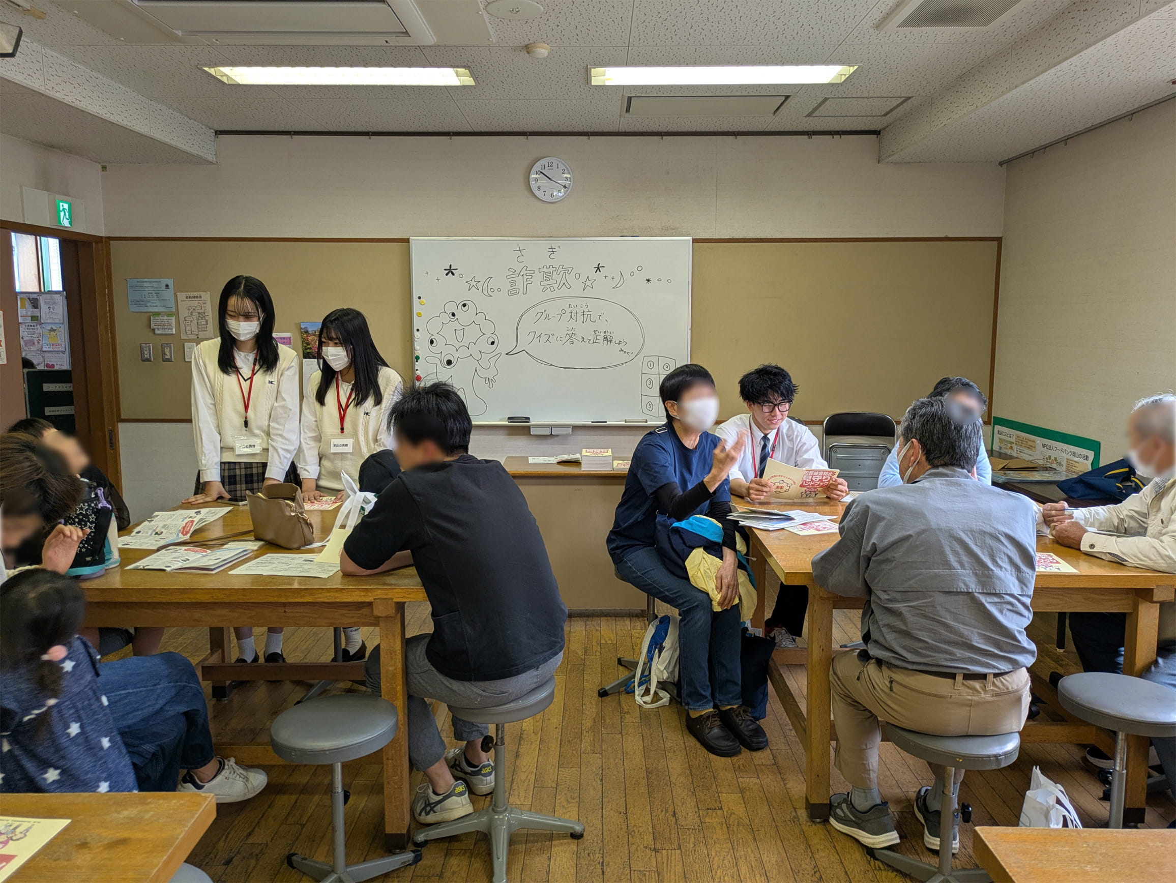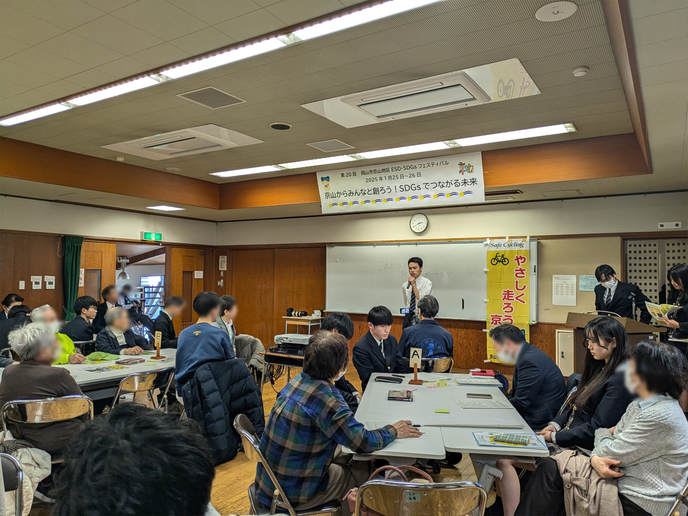 (松本教諭)「岡山市京山地区ESD・SDGs推進協議会のメンバーなどが組織する『地域の絆プロジェクト』の活動に参加させてもらい、高校生の立場からできることを考えています。京山公民館を拠点にオリジナル演劇を制作、上演する『劇団公民館☆京山』の取り組みにも関わらせてもらっています。地域の小学校で開催された防犯や防災に関するイベントでブースを担当し、地域の人たちに防犯防災について意識を高めてもらう活動を行いました。そのほか、川の清掃活動など、多岐にわたる京山地区での取り組みに参加させていただき、若者らしい考え方や意見を取り入れながら地域を盛り上げようと取り組んでいます。具体的には、2025年の『京山地区ESD・SDGsフェスティバル』でワークショップの企画・運営をしました。京山地区は自転車に乗る人が多く、危ない路地も多いため、危険な乗り方をしないように啓発することや、改善する方法について話し合うグループディスカッションを実施しました。司会や各グループのリーダーを明誠学院の生徒が担当し、各グループで出てきた意見をまとめて、模造紙に木を模して描いた『交通安全の木』に貼って完成したものを公民館に掲示していただきました。また、地域活性化と世代間交流を目指すプロジェクト『京山えーもの探検隊』では、防災などについて、地域住民に興味を持ってもらうためのイベントを実施しました。イベントでは防災クイズや緊急通報の電話番号紹介、VR(バーチャルリアリティー)を使った住宅火災や地震体験のほか、防災備品を定期的に入れ替えるローリングストックの一環で賞味期限間近の非常食のアレンジレシピを考えて参加者に試食をしてもらうなど、企画から運営までを生徒が主体となって取り組みました」