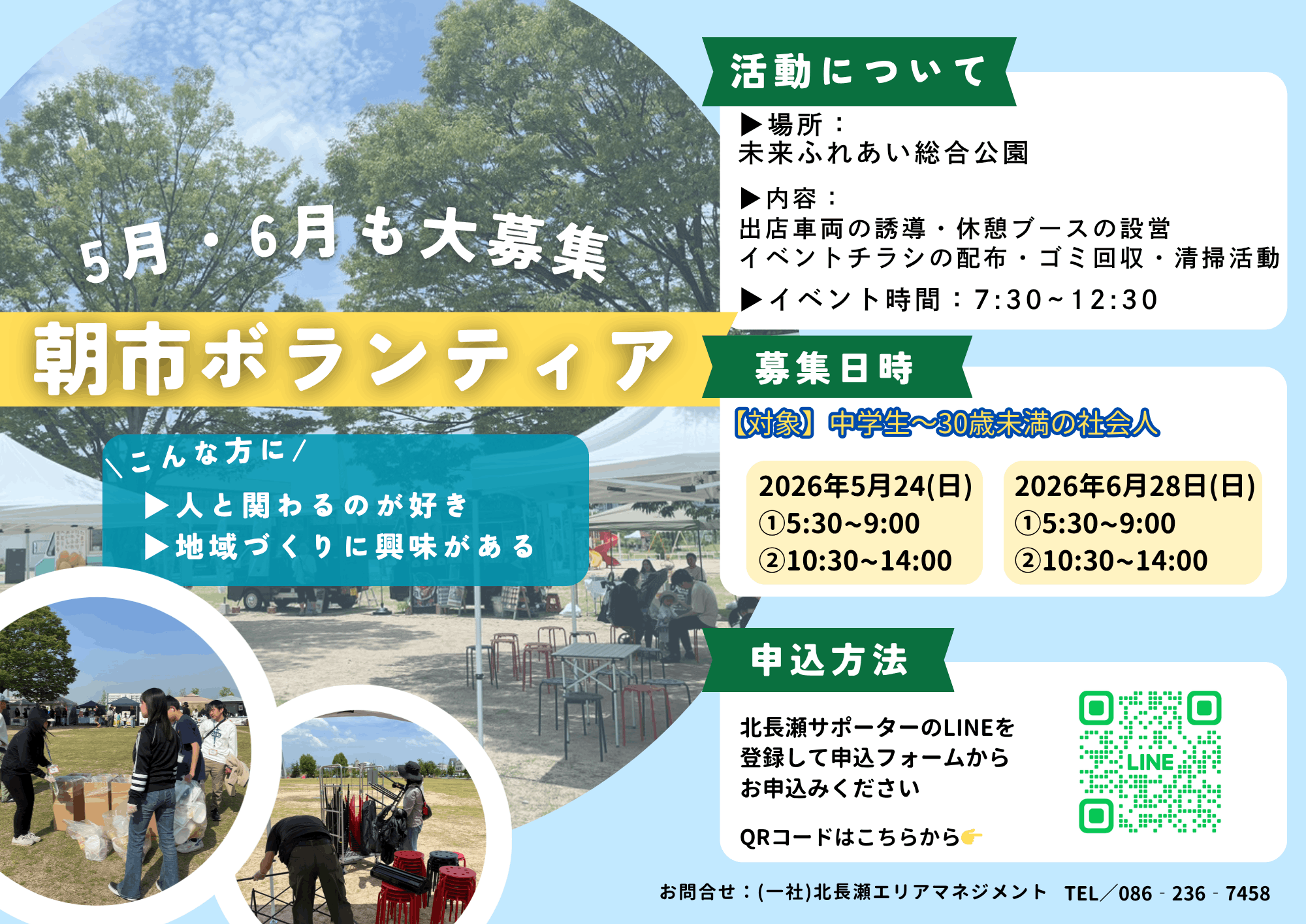 休憩ブースの設営、出店車両の誘導、イベントチラシの配布、清掃活動