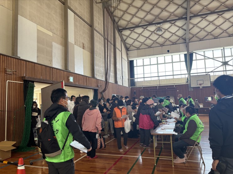前半は、避難所開設時の受付手順を実際に体験するプログラムでした。町内会ごとに体育館入口で受付を行い、「避難所利用者登録票」を記入しました。