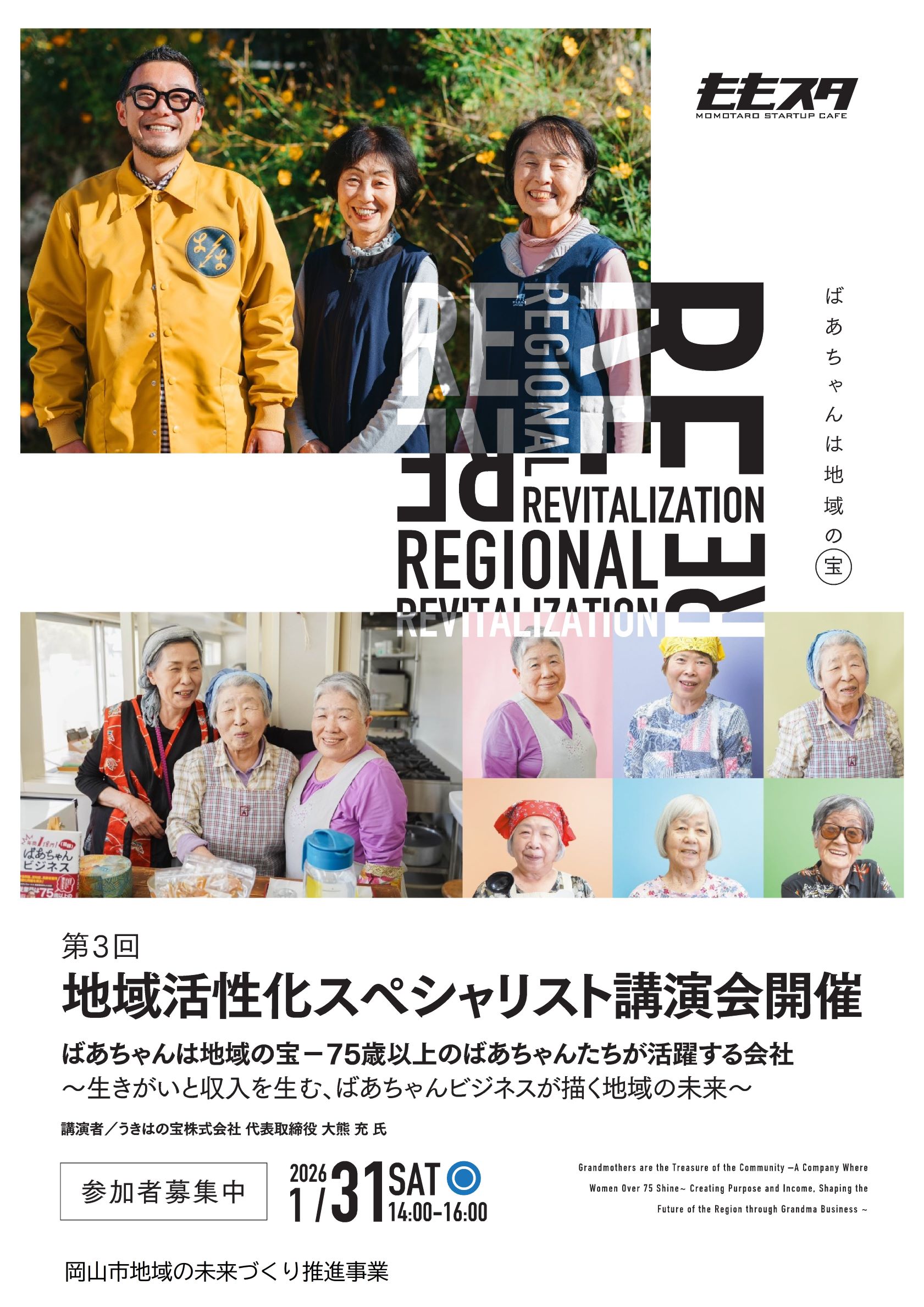 「ばあちゃんビジネス」のスペシャリスト うきはの宝株式会社 代表取締役 大熊 充 氏が「ばあちゃんは地域の宝-75歳以上のばあちゃんたちが活躍する会社」をテーマに、実際の事例を紹介しながら、地域資源を活かして新たな商品・サービスを生み出すヒントをお伝えします。