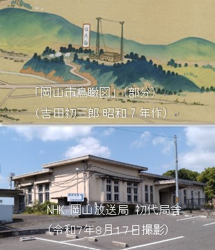 鳥瞰図画家として知られる吉田初三郎が、昭和7(1932)年 岡山市を舞台に開催された「観光博覧会」のために描いた「岡山市鳥瞰図」(当館所蔵)という作品があります。この絵に描かれた建物群の多くは昭和20年の米軍による空襲で失われましたが、中区赤坂台にあるNHK岡山放送局の初代局舎は空襲の炎を逃れ、昭和36(1961)年に丸の内へ移転するまで30年間、丘の上からラジオ放送を出し続け、岡山の街とその歴史を見続けてきました。昭和5(1930)年に建物が完成、昭和6(1931)年に開局した、現存する“日本最古”の放送局舎の94年の歴史を映像で振り返ります。
