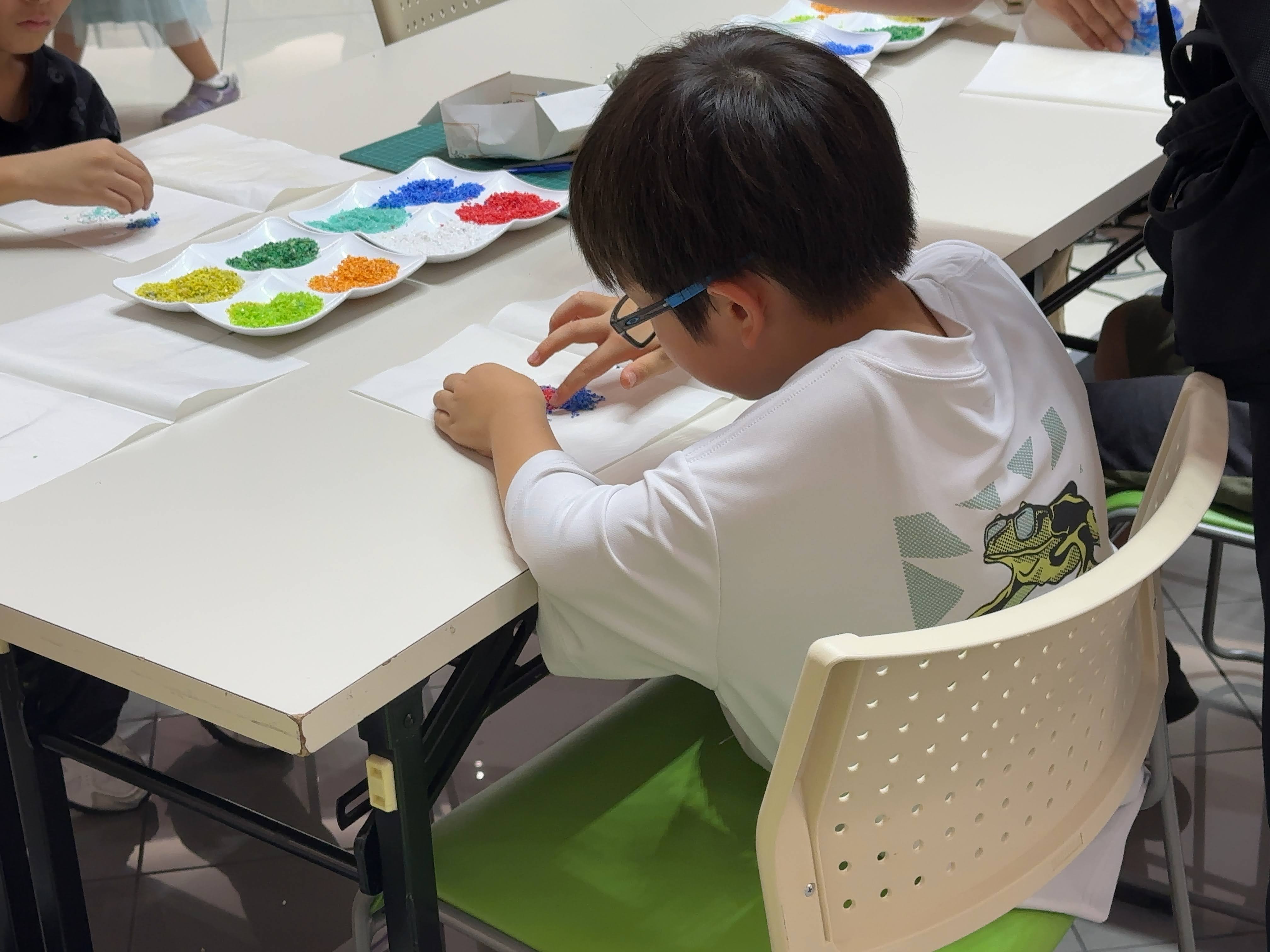 また、ペットボトルキャップを細かく砕いて色ごとに分けた素材を使ったキャップアートや、段ボールを活用した財布づくりなど、普段は捨ててしまいがちな素材を夏休みの思い出を彩る作品へとアップサイクルする体験も行われていました。