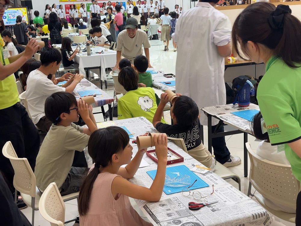 サイエンス教室では紫キャベツの溶液が酸性・アルカリ性によって色が変化する様子を観察したり、紙コップやトレーシングペーパーを使って、のぞくと景色が逆さまに映るカメラを作るなど、身近な素材で“科学の不思議”を体験。紙コップで作ったカメラをのぞき込みながら、不思議そうに声を上げる子どもたちの姿が印象的でした。
