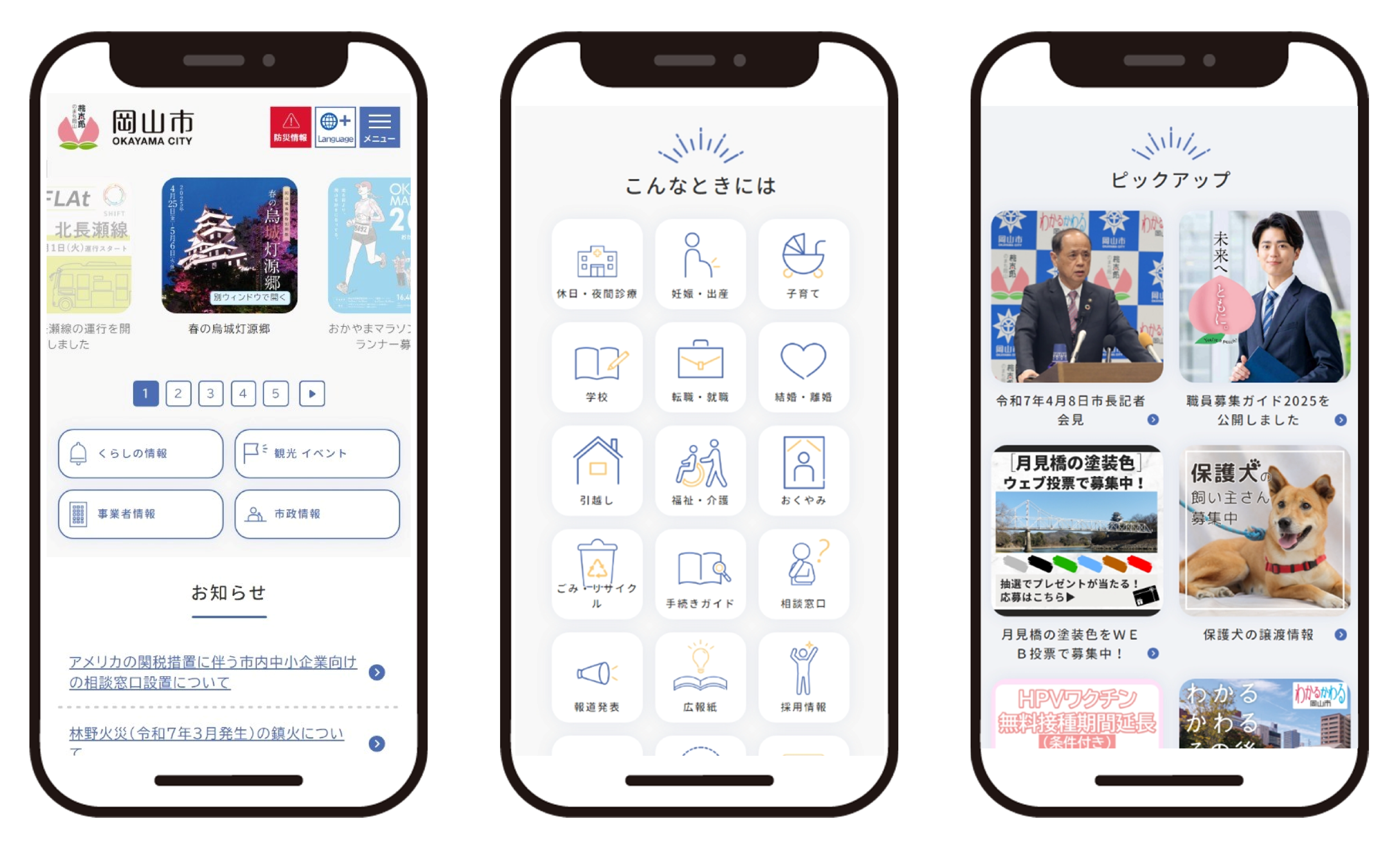 岡山市公式ホームページは令和6年9月にリニューアルしました。スマートフォンでも利用しやすく、欲しい情報にアクセスしやすいサイトを目指してデザインしています。