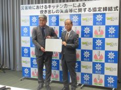 一般社団法人岡山まちの賑わい創出協会との災害時におけるキッチンカーによる炊き出し実施等に関する協定の締結式が行われ、大森雅夫岡山市長が出席しました。