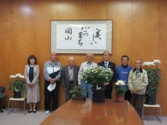 おかやま菊花協会より菊の贈呈があり、大森雅夫岡山市長が受け取りました。