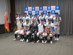 2025ヤングリーグ グランドチャンピオン大会で優勝したオール岡山ヤングの選手・関係者が、大森雅夫岡山市長を表敬訪問しました。