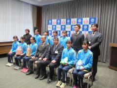 全国中学校駅伝大会女子の部において、史上3校目となる大会3連覇を達成した岡山市立京山中学校陸上競技部選手・関係者が、大森雅夫岡山市長を表敬訪問しました。